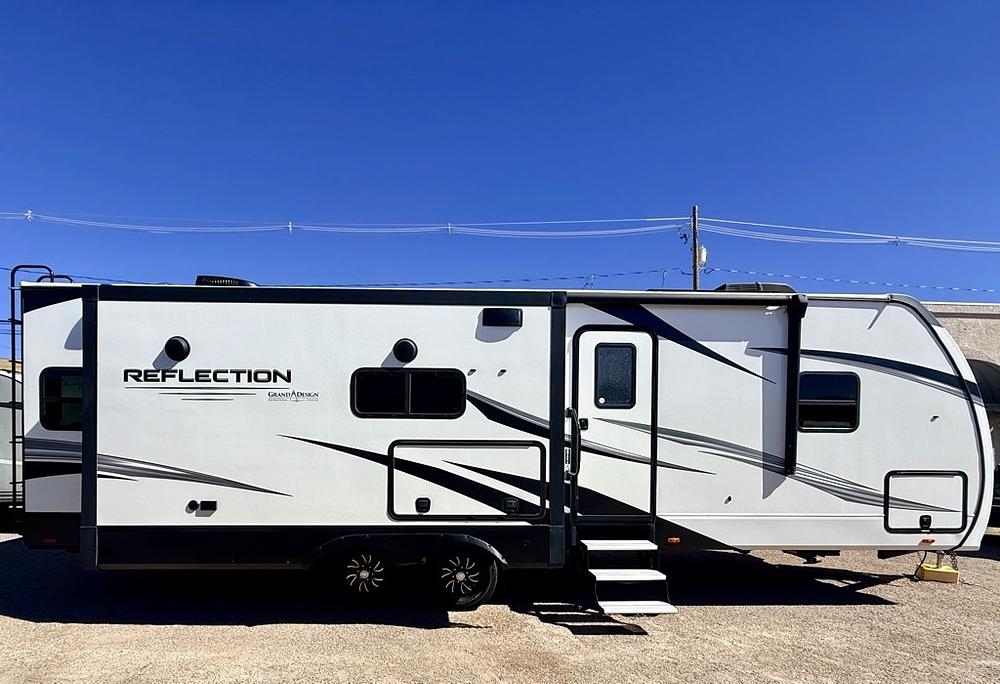 2023 Grand Design Reflection 297RSTS is a luxury travel trailer designed with a focus on towability and residential-style comfort. It is approximately 33' 11" long and features a popular rear living area with a kitchen island and two slide-outs to maximize interior space.