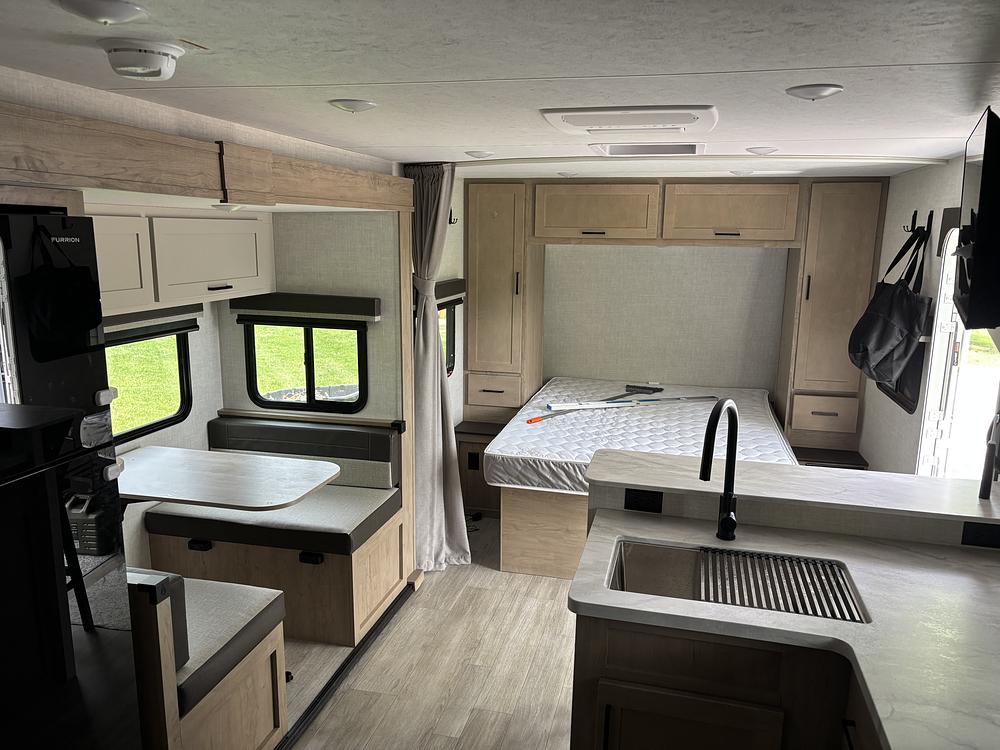 Sleeps 6. Queen bed, dinette folds to a bed, rear bunks. Bunks are on a Track system so they can be removed, configured, adjusted, and so forth.