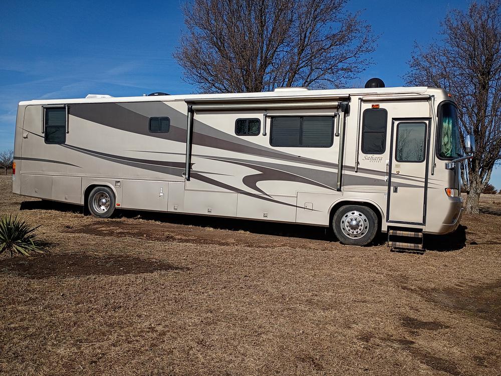 Monaco, 2004, Class A, Sahara Safari, 88255 miles, 3 slides, 350 Cummins Diesel, Auto transmission, 5500 Onan generator, good tires. Recently serviced. Lots of updated: New {4} air bags and shocks, All fluids changed filters replaced, alternator, belts and hoses, New back AC unit, All New Complete roof, with Lifetime guarentee, for leaks, tears, ect. { FLEX ARMOUR } which is transferable to new owner, for the life of the coach. New bathroom toilet. Runs and drives nicely, has been from southern Texas to northern Wyoming several times, comfotable coach to travel in, has back up camera, has pulled trailer with SUV with no problems. Interior in good condition. Selling for health reasons.