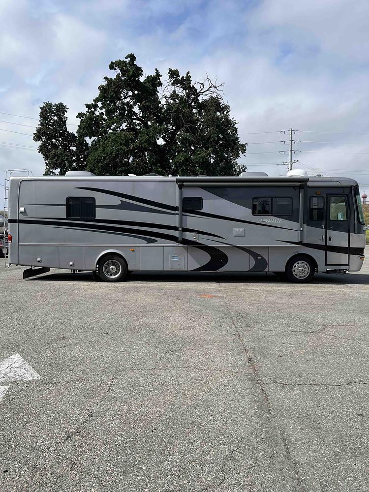 Well maintained 38 foot 2005 Holiday Rambler Ambassador with Cummins diesel pusher engine. This coach features three slide-outs resulting in a spacious living area ideal for relaxing or entertaining. Perfect for family travel, sleeping accommodations include a rear master bedroom area with a queen bed, two sofa sleepers, and a dinette that converts into a bed for the little ones. For added convenience, the coach includes a combo washer/dryer. The Ambassador has ample interior storage and includes an exterior pass through storage bay. This low mileage coach (15,799 miles) is ready for some memorable excursions.