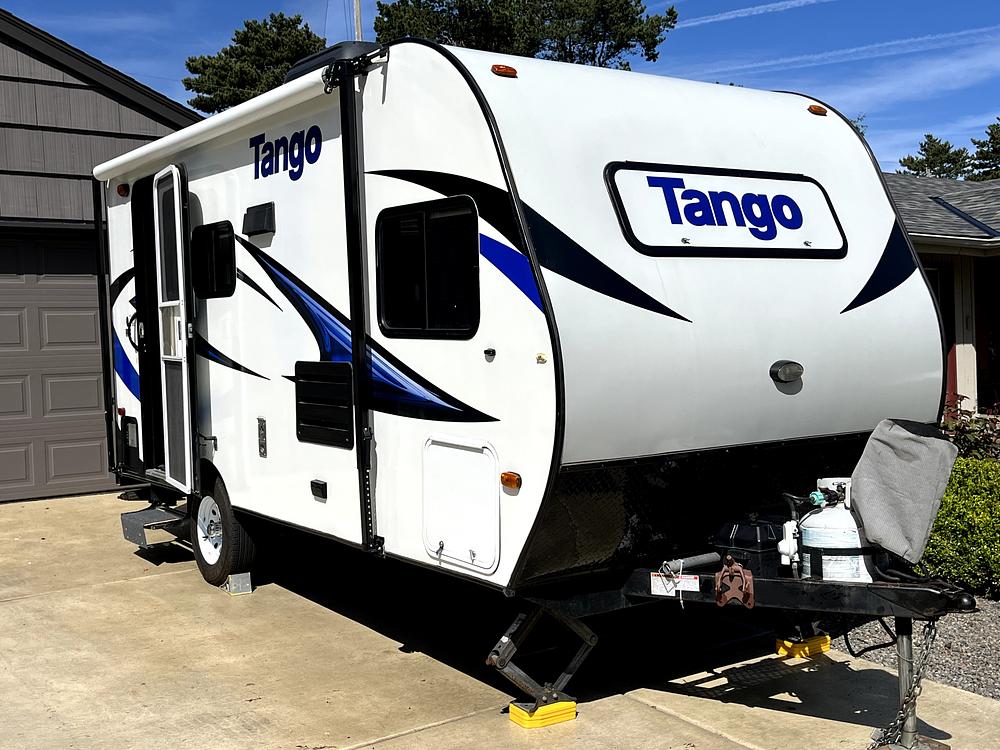 Perfect couples coach. It has been very well maintained, stored under cover, and very lightly used. This 14 foot trailer sleeps 2 in double bed, and seleeps one on 6 foot fold-out sofa. Six foot wide tip-out extends 18" and 56" tall. Very comfortable and complete: well-equipped kitchen and bathroom has commode, sink and shower.