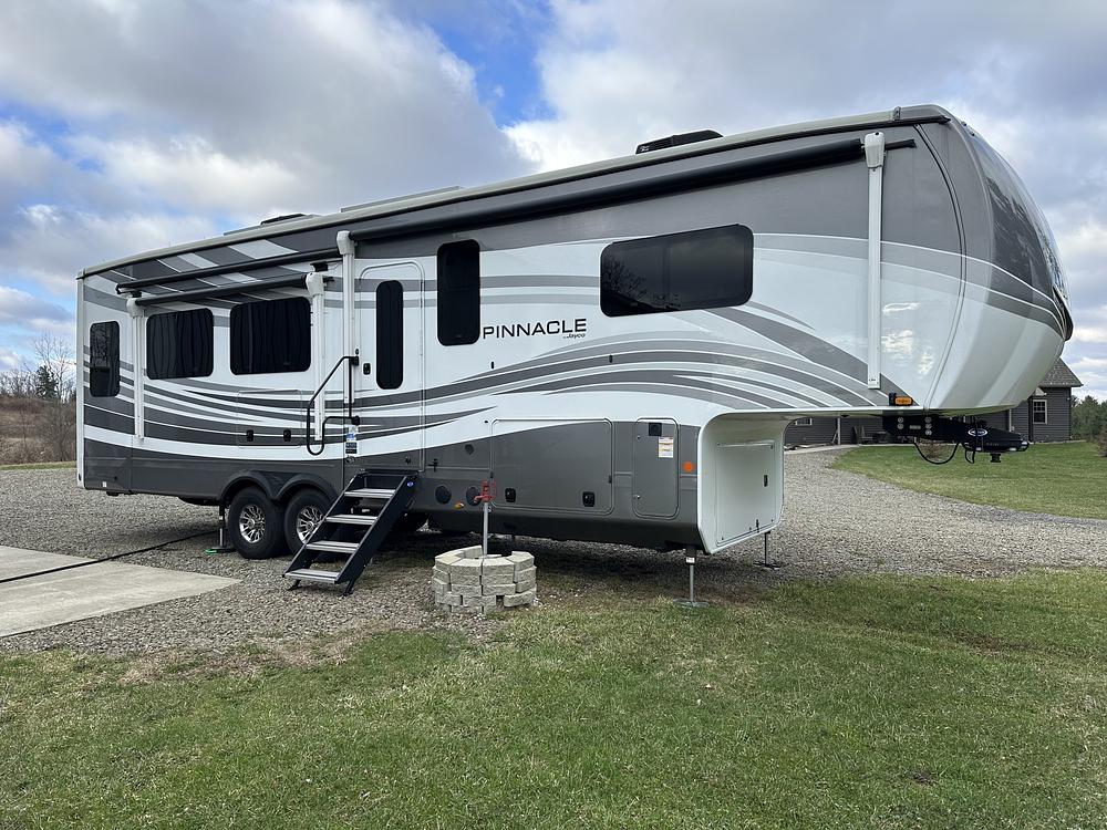 SELLING OUR 2021 LIKE NEW LUXURY PINNACLE 5TH WHEEL WITH TOO MANY OPTIONS TO MENTION!! (CHECK OUT THE LAST PHOTO OF OPTIONAL EQUIPMENT AND PRICES!!) Diamond Full Body Paint, length is 36 ft 4 in, Modern Farmhouse Style, Huge Commercial Refrigerator/Freezer, King-sized Bed with Upgraded Mattress, huge cedar-lined, lighted closet with laundry bin, prepped for washer/dryer. LUXURY PKG, JayCommand Smart RV System, Magnum Truss Roofing, MORryde Pin, Upgrade Goodyear Tires with TPMS, EXTREME WEATHER PACKAGE!!, Solar Pkg, THREE FACTORY INSTALLED SLIDER AWNINGS!!, WINEGARD AIR 360, HDTV ANTENNA, FREE TV, Gateway Router can be activated for 4G WIFI, All Manuals, RV is LIKE NEW!! Also have 4 point hitch for Dodge Ram (puck system) available with a good offer. Asking $49,900.