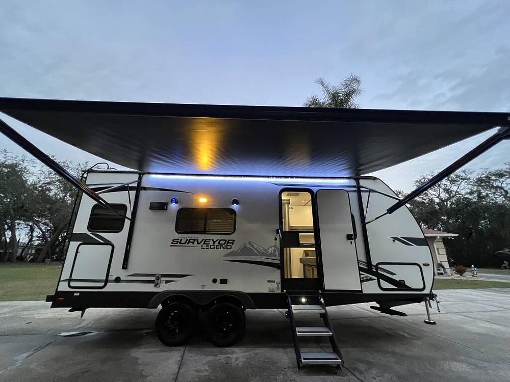 Forest River Surveyor Legend 24ft. We have to let it go.... We shopped for months before deciding on this Surveyor's floorplan. We are lifetime RVr's and knew what we wanted in a well-designed travel trailer. At just over 24ft. and at 5K lbs, it meets the length limits at most parks and is a breeze to tow. We used the trailer only 3 times within Calif., so it was never driven on road salt like in many states. We kept it covered until last week and now have it up for sale. This is the rare floorplan with extended counters, a full bath, large fridge, large dinette slide room (nite bed) and a full 3 person couch or pull-down full sized queen Murphy. I had $3K of custom additions done to include: *New entry step added (dirt stays out), *new white dinette awning added to slide room roof, *2-new high-end MaxFan w/remote ceiling exhaust units for front and bath, *new Sony smart TV, *new full queen mattress, *new wardrobe open-door lighting, *added USB ports and night lights in both queen bed cubbies. I'll include the E2 distribution hitch system, full brake controller, plus all required new hoses, new rear Shark camera, power shore cords, etc.. I just replace the 2 marine deep cycle batteries and the tires are perfect with no cracks.