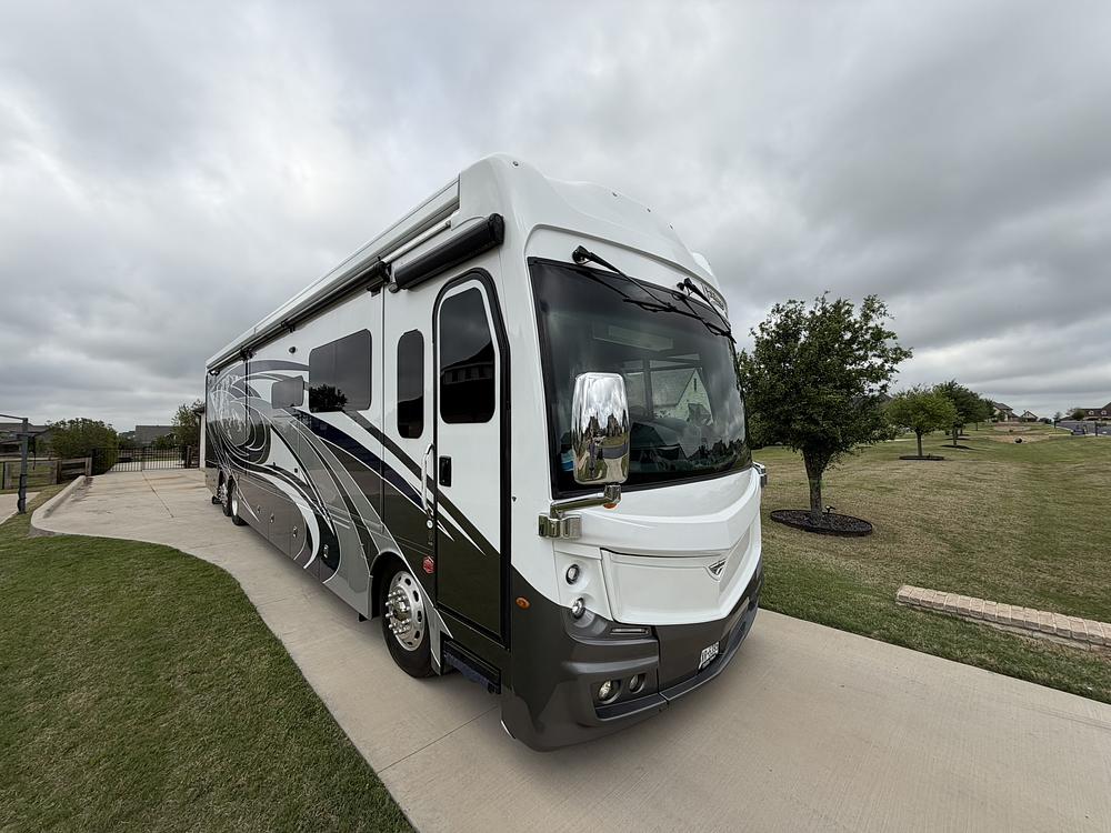 Inside, the cabin is spacious and elegantly designed, with high-end finishes and amenities that make it feel more like a luxury hotel room than a motorhome. The kitchen is fully equipped with top-of-the-line appliances, including a stainless steel refrigerator, microwave, and stove, making it easy to prepare gourmet meals on the go.