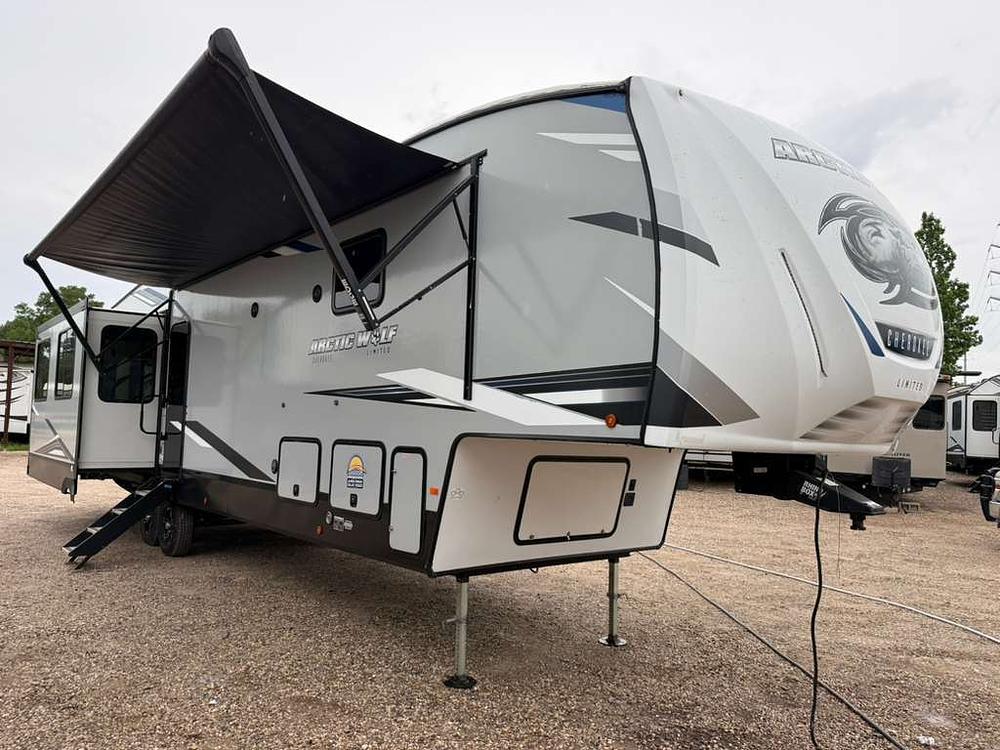 - Exterior: Power awning • Outdoor kitchen • Pass-through storage • Arctic Wolf extended-season construction