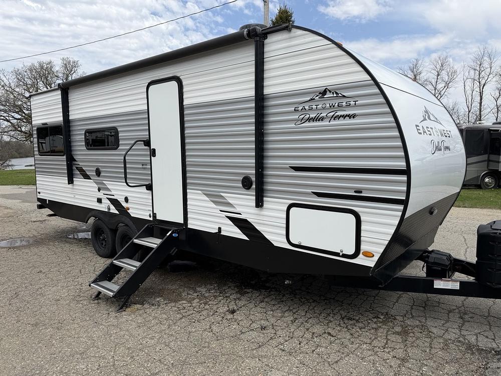 With any Della Terra travel trailers by EAST TO WEST, there is aluminum siding, bowed truss roof rafters, a one-piece seamless DiFlex ll roof, fiberglass insulation throughout, and a fully enclosed and heated underbelly with anti-puncture underbelly allowing you to stay and travel during any climate. The interior offers comfort and convenience throughout with an 81" ceiling height, seamless designer countertops, night shades to be able to sleep in, a sound system with Bluetooth and HDMI connectivity, and an extra large dinette picture window for great views. Choose a Della Terra that fits your camping lifestyle!