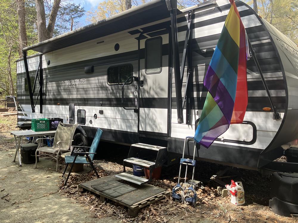 Comes with X-chocks, slideout jacks, and leveling blocks.