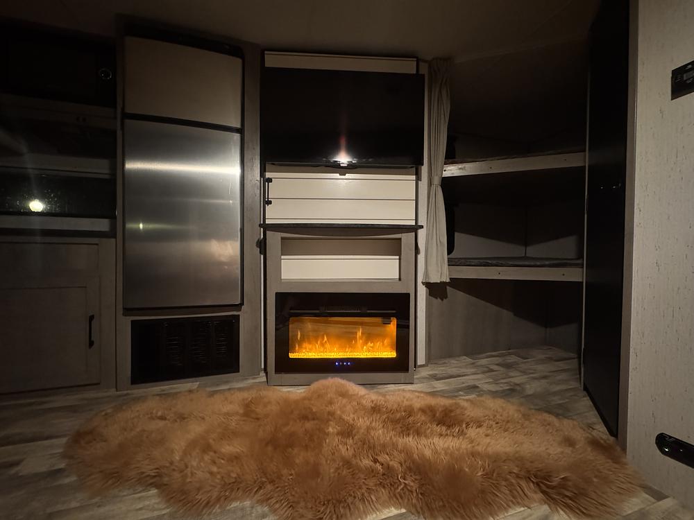 The 27SBH trim level offers plenty of room for sleeping and lounging, with a comfortable queen bed in the master bedroom and bunk beds for the kids. Stock bunk beds have paper thin bases so we added actual plyboard base and the mattresses are perfect, covers have also been washed. The living area features a cozy dinette and a sofa that can be converted into an extra sleeping space. TV comes with the unit and there is also an electric fireplace. Behind fireplace is a large pantry.