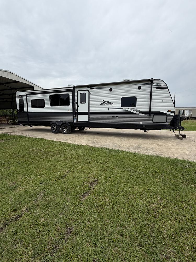 2022 Jayco Jay Flight 34 RSBS bumper pull camper. Great condition, kept under roof. This camper features KING size bed in a spacious master suite, 2 ACs, 3 Large Slides, Fireplace, Entertainment Center, Theater Seating, Fold out sofa bed, Large shower, Kitchen Island, Pantry and LOTS of storage, hutch in kitchen for additional counter space and cabinets, Free Standing Table w/ 4 chairs, Power Awning with LED lights, Electric stabilizer jacks, Power tongue jack, Spare tire w/cover, Lots of storage in kitchen, bathroom, under bed, closets etc. Very nice, spacious and comfortable! $26,500.