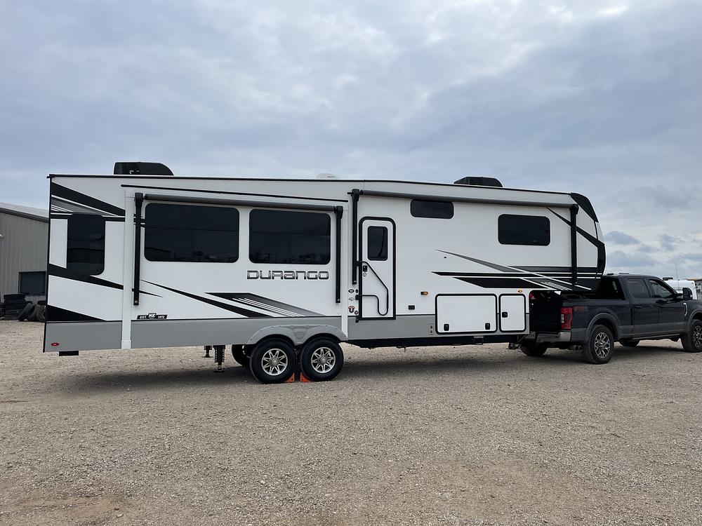 2023 K-Z Durango 301RLT fifth wheel. This popular floor plan has a living room in back with pull out sofa, recliner loveseat, and fireplace. Residential refrigerator and stove and pantry. King size bed with upgraded Wilderness mattress. Lots of other upgrades to include new Goodyear tires, sumo springs, TPMS monitoring system, rear camera, upgraded interior fans and lighting. STARLINK internet and flagpole buddy mounting system.
