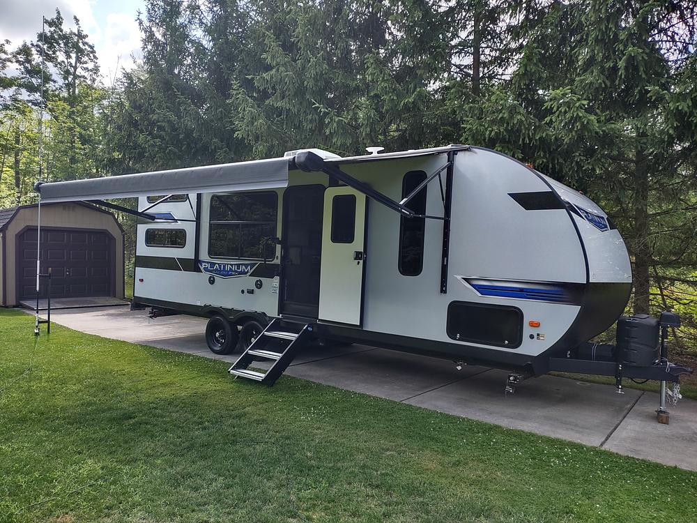 Exterior: 15-foot power awning with LED lights, exterior speakers with blue LEDs, Bluetooth speaker system, and side-mounted solar port.
