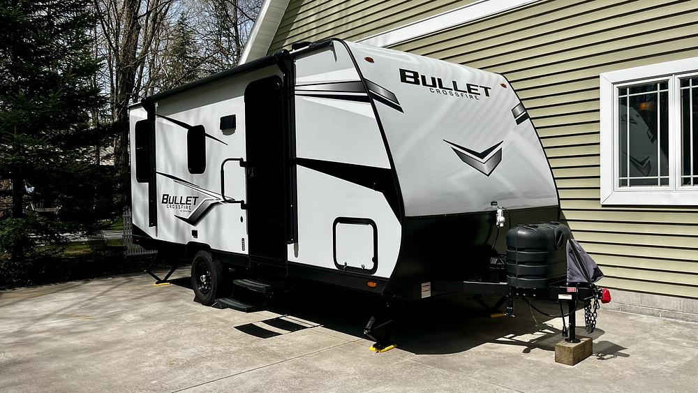 This well-maintained Keystone Bullet Crossfire 1900RD is a sleek and functional travel trailer featuring a large U-shaped rear dinette with large windows, perfect for letting in natural light and taking in the view. This trailer has been upgraded with solar for extended dry camping/boondocking.