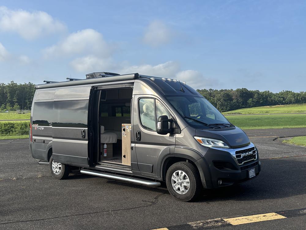 This motorhome features a rear wet bath/shower design with storage, a twin bed which is easily converted to an RV-king size matress. The floor plan includes a living area with Lagun table, kitchen with refrigerator/freezer, a convection microwave, two burner propane stove and sink. Modern Firefly and Truma touchscreen conrols for climate and lighting control with integrated navigation and entertainment systems. Based on the Ram Promaster 3500 chassis, the size makes for easy driving and good fuel economy. Upgrades include Rover rear ladder with full size tire, full coverage rear door bug screens with privacy shades, Rover rear mount storage box with bike supports, drop down personal item storage trays above each bed, retractable child/pet screen for side door, and soft-close drawer tracks.