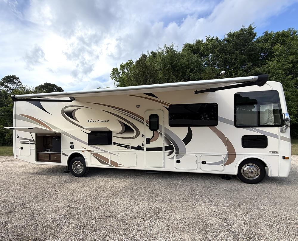 Well-maintained and extensively upgraded 2017 Thor Hurricane 34J bunkhouse motorhome with 23,783 miles. This Class A coach is built for families and large groups, featuring one of the most popular bunkhouse floorplans plus high-end upgrades rarely found in gas coaches.