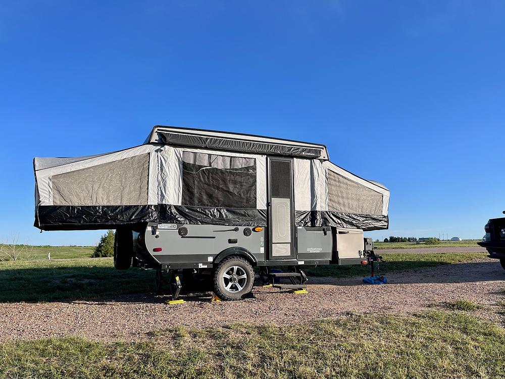 Outside there is a propane grill that attaches and hooks up, roll out awning, and a large slide out storage box in front, which can be accessed with camper open or closed.