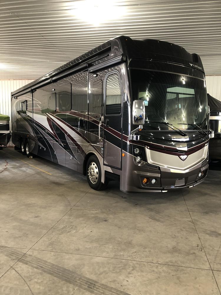 Inside, the Fleetwood Discovery LXE 44H features a well-equipped kitchen with high-end appliances, a cozy living area with plush leather seating, and 1.5 stylish bathroom with modern fixtures. The bedroom offers a comfortable sleeping space(king-size bed), with ample storage for clothing and personal belongings. The owner's suite boasts a full size shower. The interior design is both functional and aesthetically pleasing, with high-quality materials used throughout. This motorhome sleeps six.