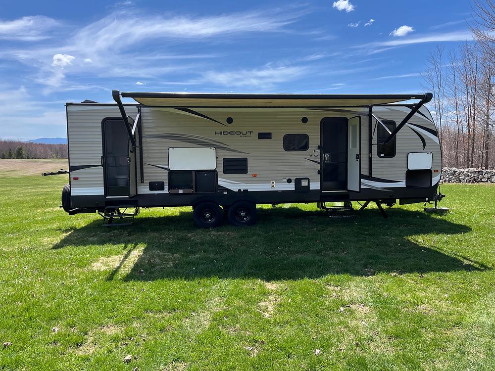 This travel trailer is designed with comfort and convenience in mind. The spacious interior offers plenty of room for the whole family, with sleeping arrangements for up to 8 people. The layout is thoughtfully designed to maximize living space, with a separate bedroom, full bathroom, and a well-equipped kitchen area. The Hideout 28BHS also features plenty of storage space for all of your gear and belongings. There is also a 50 flat screen tv with surround sound, as well as as central vacuum.