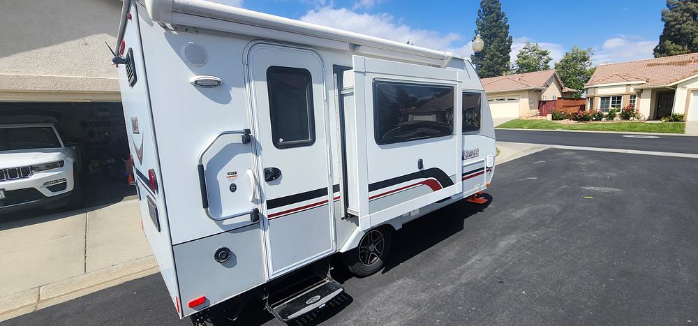 Lightweight (2905#) two person trailer has footrest love seat and full 80" east west bed. European Truma combi water heater and furnace is very quiet and efficient running on both propane and electric. The refrigerator is 3 way and there is a large slide out tray in the storage compartment. The awning has a wind sensor and will retract automatically. This high end trailer was hardly used during covid and stored in covered parking most of it's life.