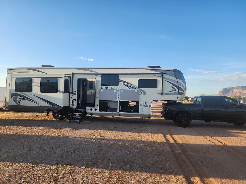 42'8" 5th wheel RV with a bunkhouse, perfect for a big family or group. 4 full slideouts. The master bedroom has a king-size bed, and the bathroom features a spacious 48x30 shower and a porcelain toilet. The kitchen is equipped with a residential refrigerator, and the living area has a 50" TV on an televator system and a cozy fireplace. The RV also comes with a Cummins Onan 5500 LP generator. Auto level system, wired for Solar. Outdoor kitchen. The seller is including all the gear, hookups, and accessories. This RV can sleep up to 9 people comfortably, though I did remove the fold-out in the bunkhouse. This unit has been wonderful to my family. Professionally maintained every year with roof maintenance, wheel bearings, brakes, HVAC system etc. Will deliver if needed. If your truck is a 2020 GMC or newer, I will also include the 20k lbs B&W Companion Slider hitch ($1600) value.