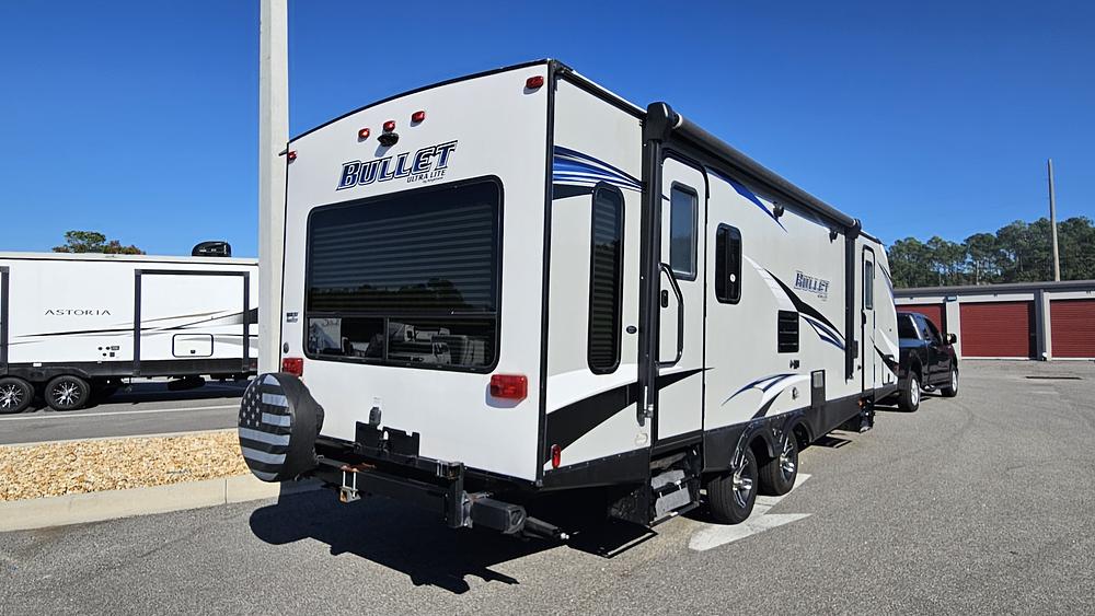 The 2019 Keystone Bullet Ultra Lite 269RLS is a travel trailer with luxurious look and feel, an abundance of practical features, innovative floorplan, and unrivaled towability at the lightest weight possible. The Bullet Ultra Lite 269RLS is perfect for long road trips or weekend getaways, offering plenty of space for relaxation and entertaining. The interior features plush seating, a fully equipped kitchen, a new 18K Btu Furrion ducted air conditioner, and a cozy bedroom for a restful night's sleep. The exterior offers a large power awning with LED lights for outdoor lounging, as well as pass-thru storage compartments for all your gear. The trailer just completed the required Annual Maintenance for the Warranty for Life renewal (not transferrable) with available receipts. This travel trailer promises a smooth towing with its 43" wide stance Dexter axles, aluminum frame construction, and aerodynamic design.