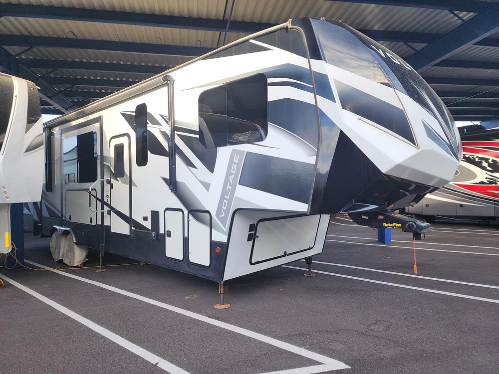 2020 Dutchmen Voltage model 3635, 40 foot 5th wheel toy hauler with three slides. There are two awnings: one on the front side and one over the toy entrance. The toy entrance also converts into a deck. RV has a Cummings Onan generator with very few hours. RV also has outdoor shower, gas fueling area for toys, and large outdoor TV for