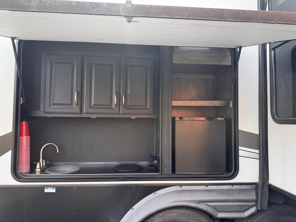 Outdoor Features: Outdoor kitchen Outdoor shower Large rollout shelving storage near the front door Huge rear storage compartment across the back of the camper Two large propane tanks (approx. 5060 lb)