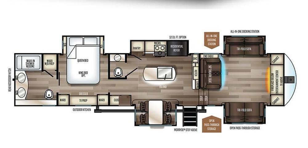 Outside the 5th Wheel has a large pull through storage, an outdoor kitchen with a sink and small refrigerator, and a tv mount. It also includes enhanced power options of solar, gas or electric for all appliances.