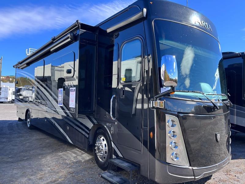 THIS 2023 PRE-OWNED ARIA 3901 is approximately 39 feet in length and features one the most impressive lists of standard equipment you'll find including: (3) slide-out rooms including a full wall slide, 1½ Bath floorplan, stacked washer / dryer, Multiplex wiring, Leather booth dinette converts to a bed, Ultra-Leather Theater Seating opposes a Ultra-Leather Sofa bed, solid surface counters, LED Power Lift TV, exterior LED TV, induction cooktop, fireplace, beautiful ceramic tile floors, tilt-a-view inclining bed, invisible front paint protection & front electric drop-down overhead bunk.