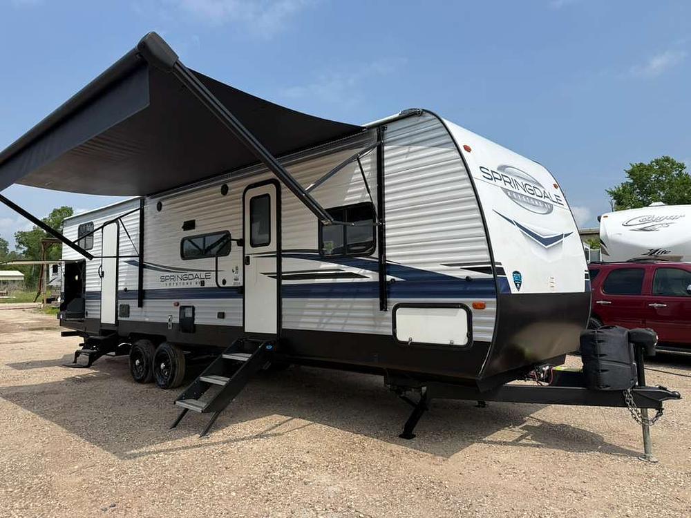The Springdale SG303BH is a highly desirable bunkhouse travel trailer, offering tons of sleeping space, a private bunk room, outdoor kitchen, and dual A/Cs—perfect for large families or long trips.